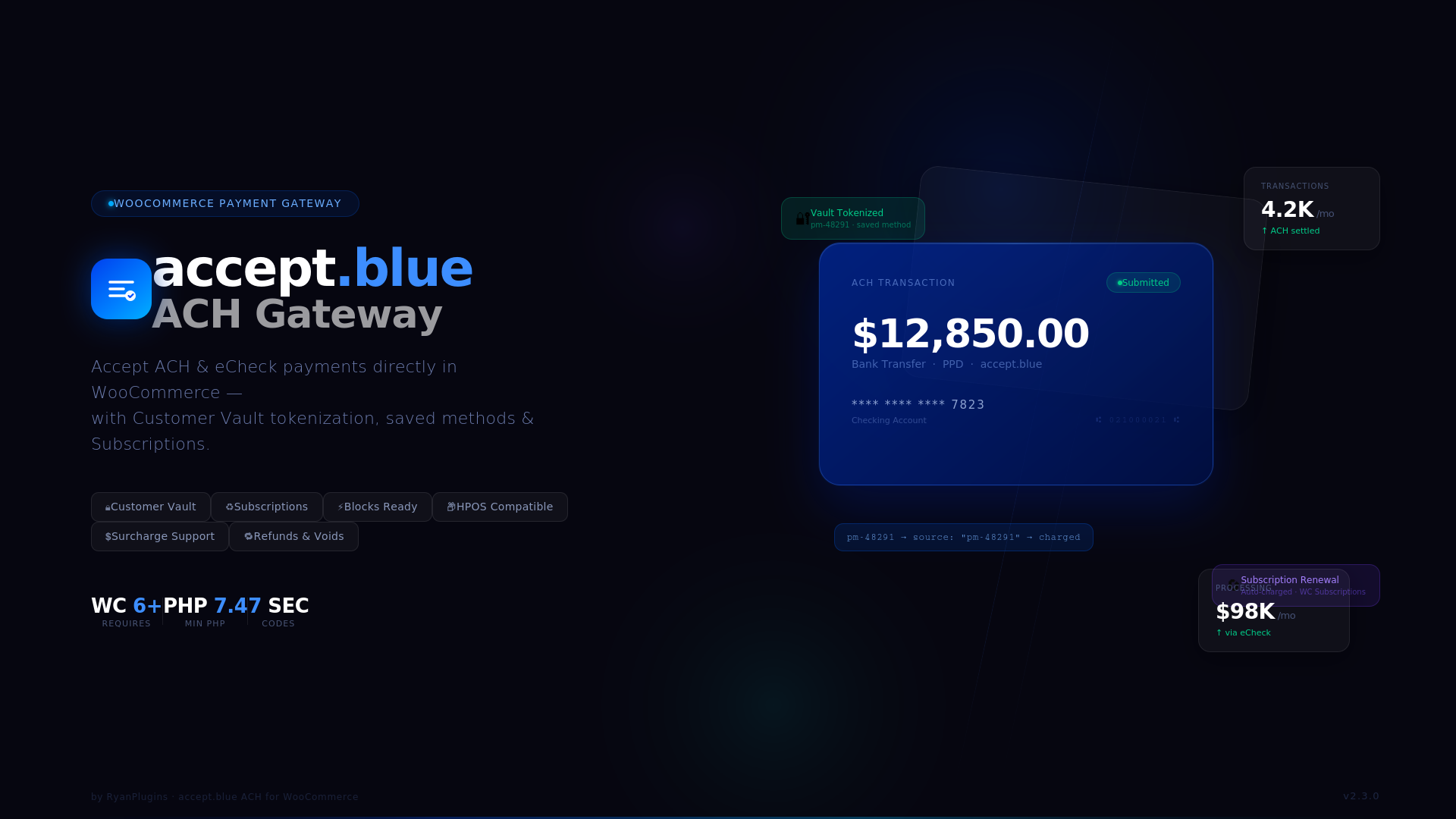 Take your WooCommerce store to the next level with the Accept.Blue ACH / eCheck Gateway for WooCommerce — a powerful payment plugin that seamlessly integrates direct bank payments into your online shop using the Accept.Blue API v2. This professional-grade gateway allows you to accept ACH and eCheck bank transfers securely inside WooCommerce while offering full support for recurring payments, tokenized bank accounts, automatic order status sync, surcharge fee setup, and compatibility with both Classic and Block checkouts. It’s ideal for subscription-based businesses, membership sites, high-ticket purchases, and merchants who want lower processing costs and reduced chargebacks compared to card-only gateways.