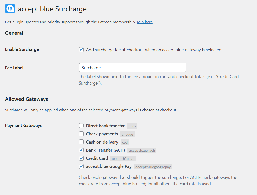 Unlike typical surcharge plugins that modify the cart total, this plugin integrates directly with the accept.blue surcharge API, ensuring that fees are applied correctly during payment processing.