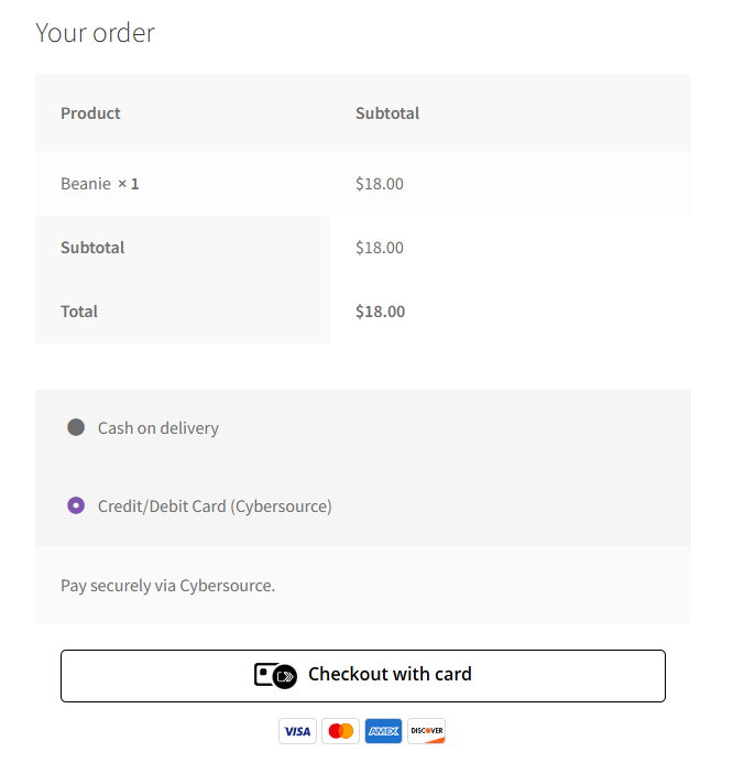 Accept payments via Cybersource Unified Checkout (UC) for WooCommerce. Collects payment details with Cybersource-hosted UI, sends transient token to Cybersource Payments API.